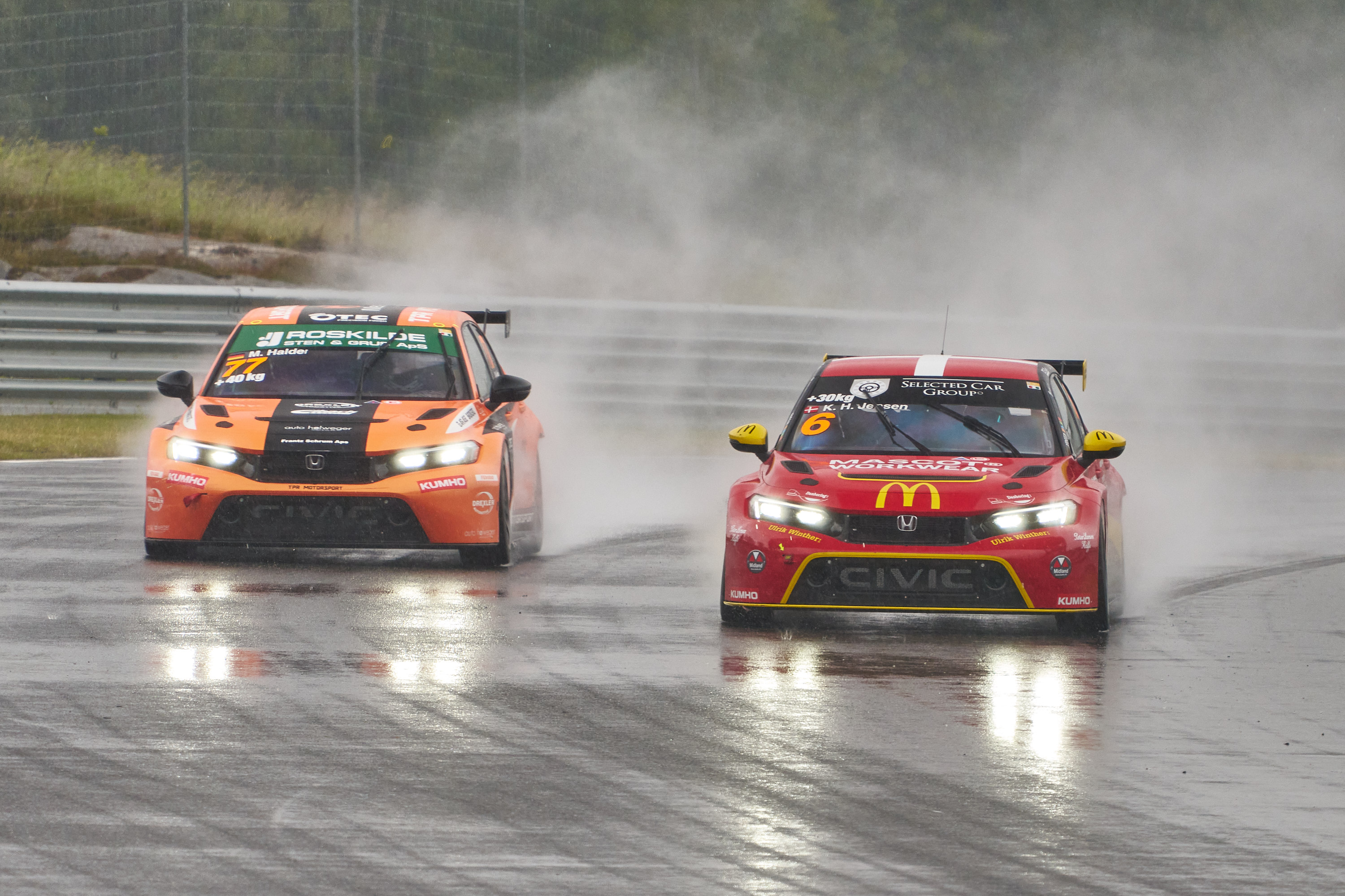 I front blev der kæmpet i det våde element. Mike Halder veg ikke mange meter fra Kasper H. Jensens bagkofanger. Det lykkedes ikke tyskeren at komme forbi, heller ikke selvom Mascot Motorsport-køreren undervejs lavede flere småfejl.